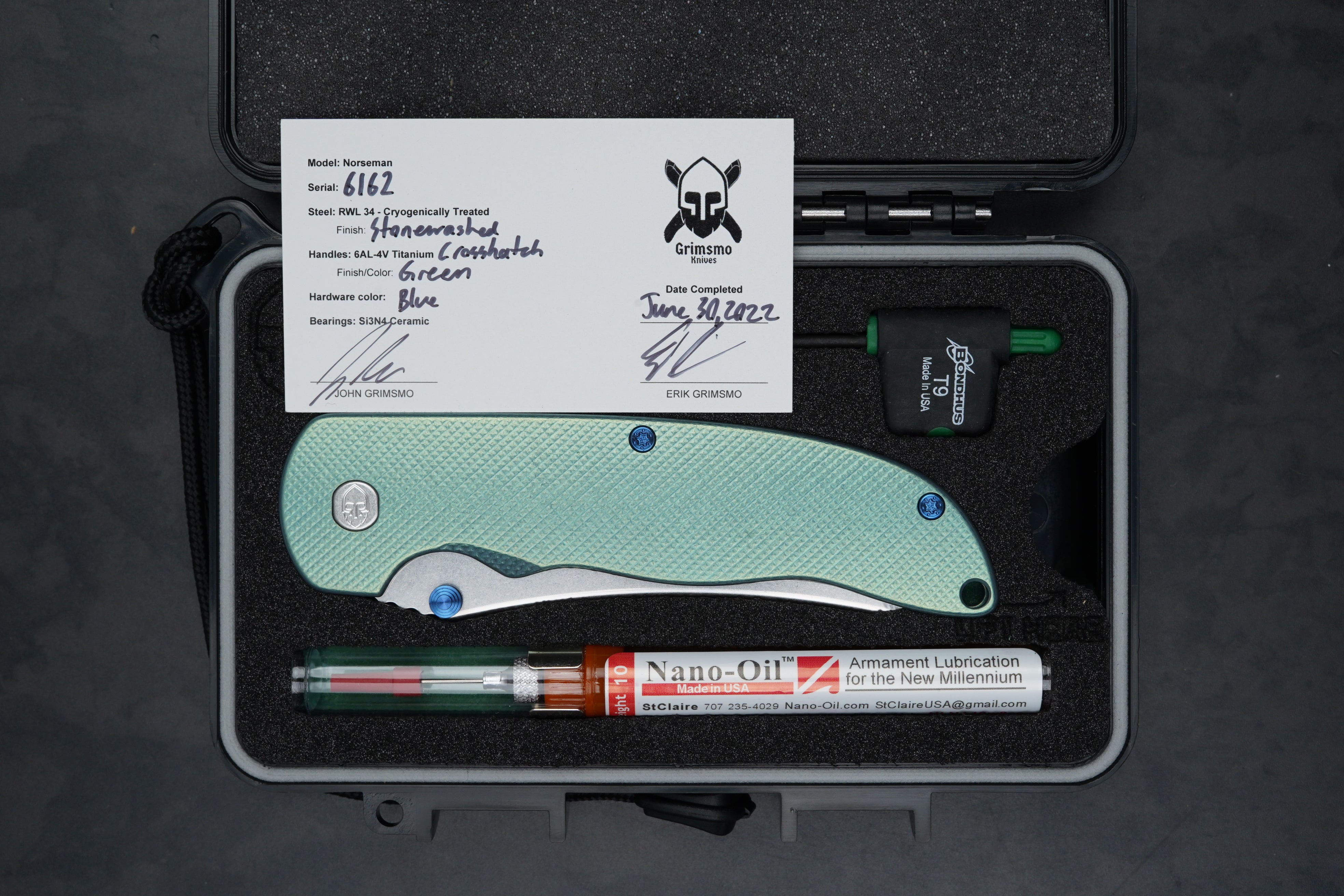 Green crosshatch pattern anodized titanium handles, blue anodized titanium hardware, stonewashed RWL 34 cryo treated blade, ceramic bearings, AEB-L Stainless lock bar insert.