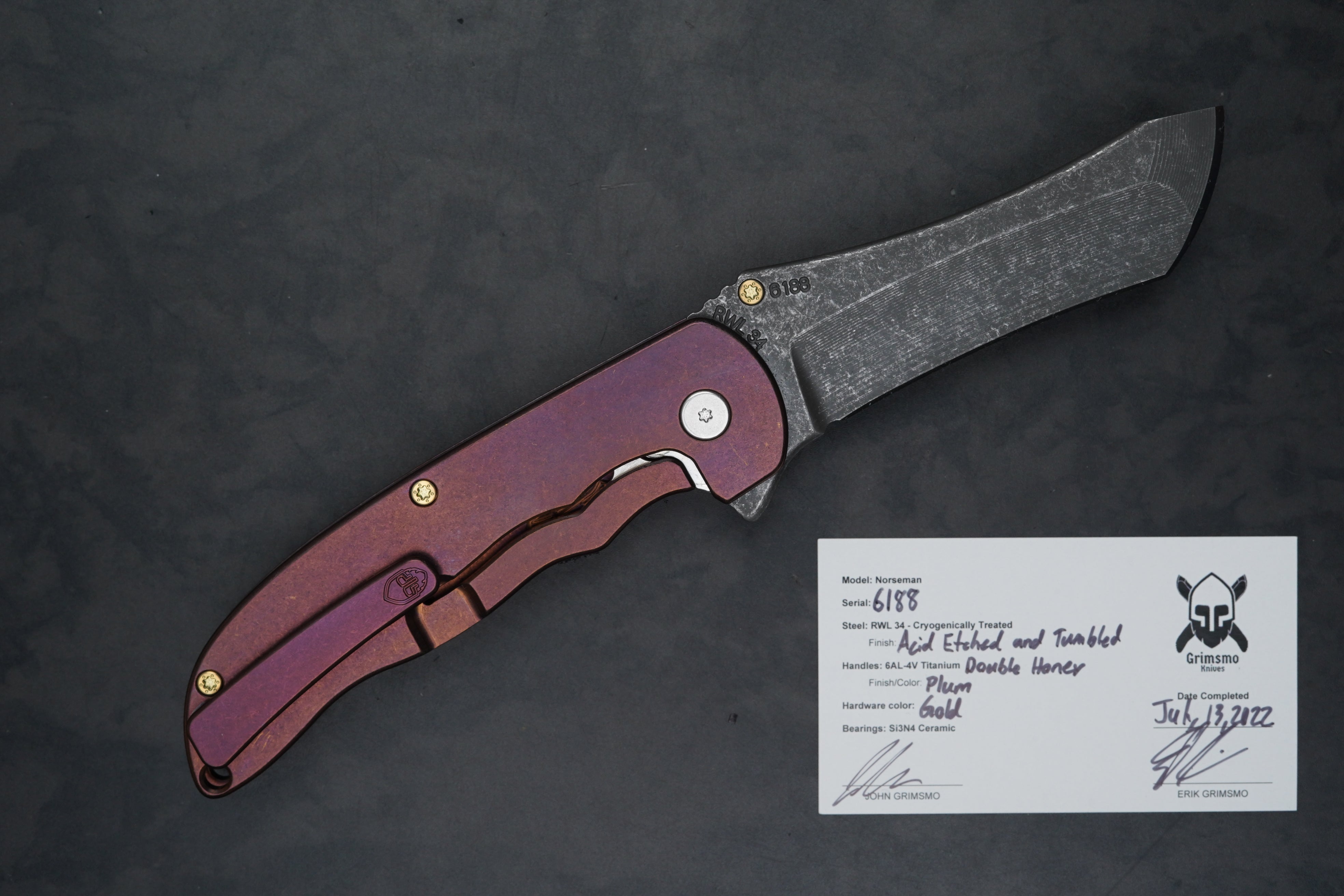 Plum double honeycomb pattern anodized titanium handles, gold anodized titanium hardware, acid etched and tumbled RWL 34 cryo treated blade, ceramic bearings, AEB-L Stainless lock bar insert.