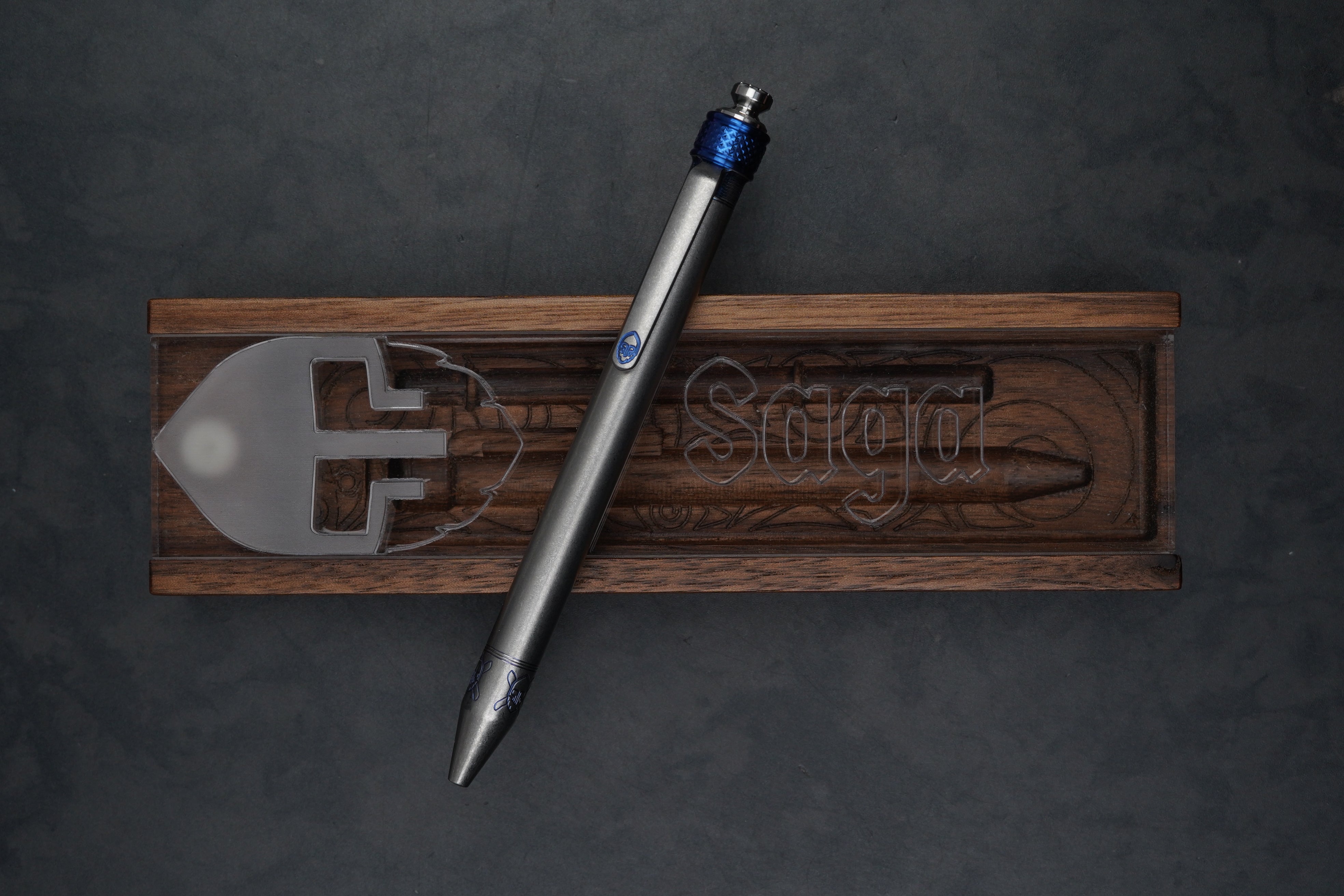 Custom titanium Saga pen, 17-4 stainless mechanism with ceramic ball bearings. Custom made wooden case with acrylic top and extra ink insert included.